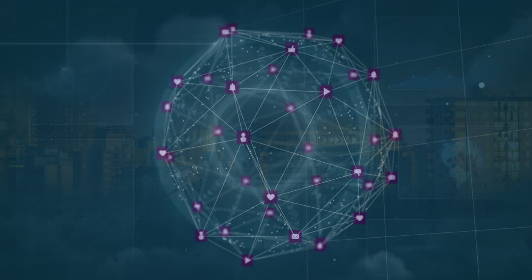 This visual displays an abstract globe populated by various icons interconnected with lines, against a backdrop of city buildings. The scene evokes themes of technology, digital connectivity, and modern internet networks. It can be utilized in descriptions or publications regarding internet communications, advanced networking solutions, or smart city technology integration.