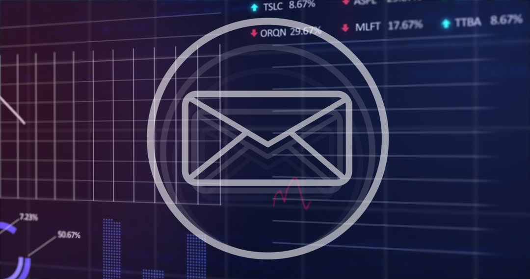 An abstract illustration showcasing a digital envelope icon superimposed on a background filled with financial stock market data, changing numbers, graphs, and trading boards. This video suggests the intersection of technology and business communication. Perfect for use in contexts related to finance, technology integration, email marketing strategies, or digital data analysis platforms.