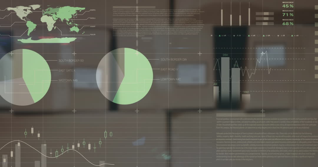 Abstract digital representation of financial graphs overlapping videos of packages in warehouse conveying modern strategies in logistics, trade, and economic planning, suitable for illustrating innovations in supply chain management or digital transformation in business.