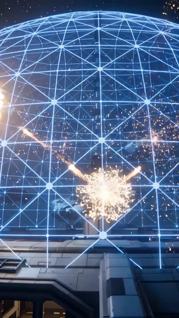 AI Generated Image. Vertical video showing holographic geodesic dome over hull module taking hit from plasma streaks, producing sparks and particle bursts across blue lattice grid. Camera angle looking up along hull, revealing curved grid dome with glowing nodes and intersecting lines, creating strong sense of scale and tension. Visual style cinematic and futuristic, featuring neon blue tones, high-contrast lighting, and realistic VFX sparks. Footage working well as looped background, title opener, or action cut for trailers and promotional reels. Use in sci-fi and technology projects, game trailers, space station sequences, cybersecurity presentations, product demos, and broadcast opens. Edit tips: crop for social platforms, add on-screen text in upper third, slow motion on impact frames for dramatic emphasis, and color grade to match project palette. Video properties: vertical 9:16 orientation, strong mid-high detail in particle effects, clear center of action near hull node.