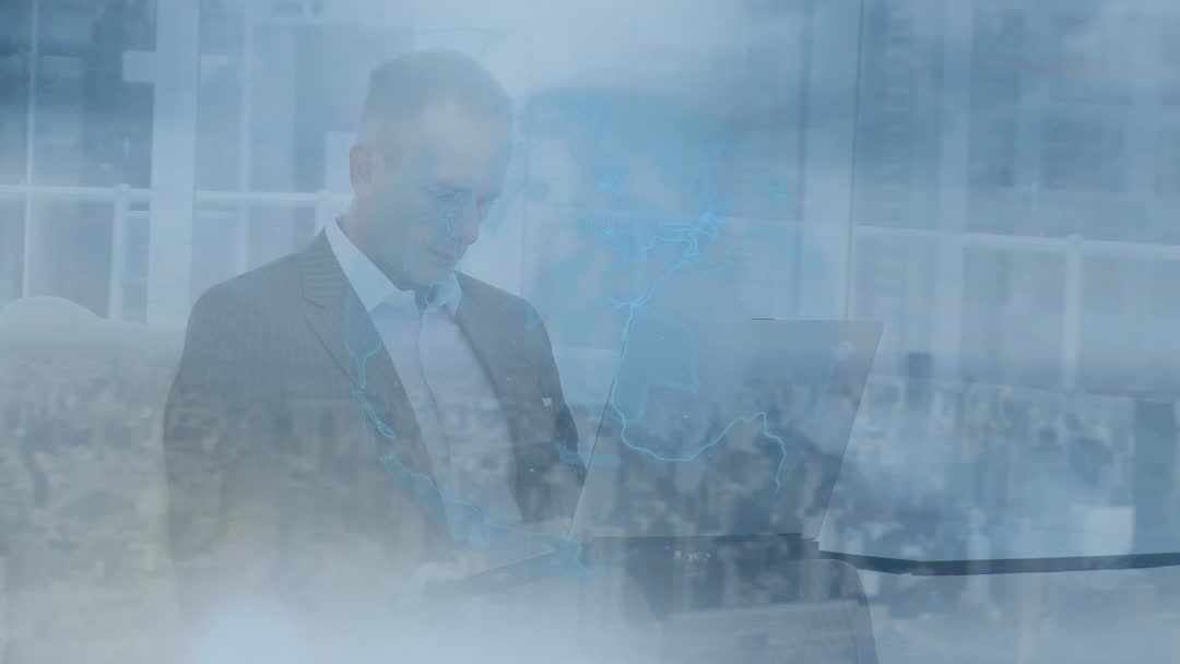 Holographic Globe Overlapping Businessman Using Laptop Video