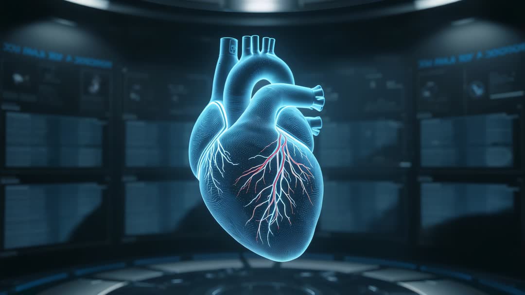 AI Generated Image. Rotating holographic heart model pulsing above circular platform in dark medical lab, coronary arteries glowing red and blue to indicate arterial and venous flow. Wireframe anatomy and subtle scan overlays animating while camera slowly orbiting and zooming to reveal left anterior descending branch and major vessels. Offering high-tech visualization for cardiology training, surgical planning, patient education, medical marketing, biotech presentations, and AR/VR demonstrations. Suiting use as video intro, explainer animation, e-learning module, conference graphic, or clinical research visualization. Providing clear focus on vascular pathways for teaching pathology, demonstrating stent placement scenarios, and enhancing telemedicine consultations.