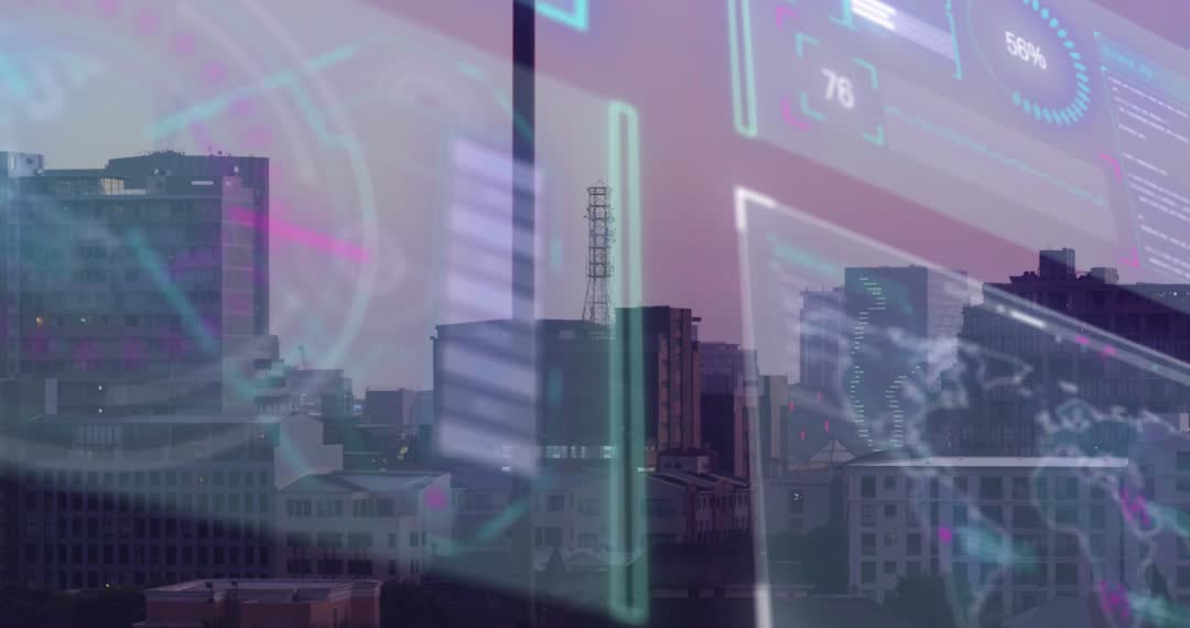 Video showing holographic HUD overlays sliding left across twilight city skyline, pulsing and updating values with radar sweep and digital map elements. Layers showing translucent panels, circular gauges, numeric readouts, grid lines, and animated flow lines blending with urban silhouettes and communication tower. Mood conveying futuristic, neon, high-tech, cinematic atmosphere ideal for tech-forward storytelling. Use for tech commercial, startup pitch, smart city presentation, cybersecurity demo, broadcast opener, corporate background, website hero, app UI showcase, motion graphics project. Include logo reveal, lower-third overlays, headline text, or CTA for branding. Recommend looping short segments for background usage, pairing with ambient electronic soundtrack, and color grading to match branding palette.