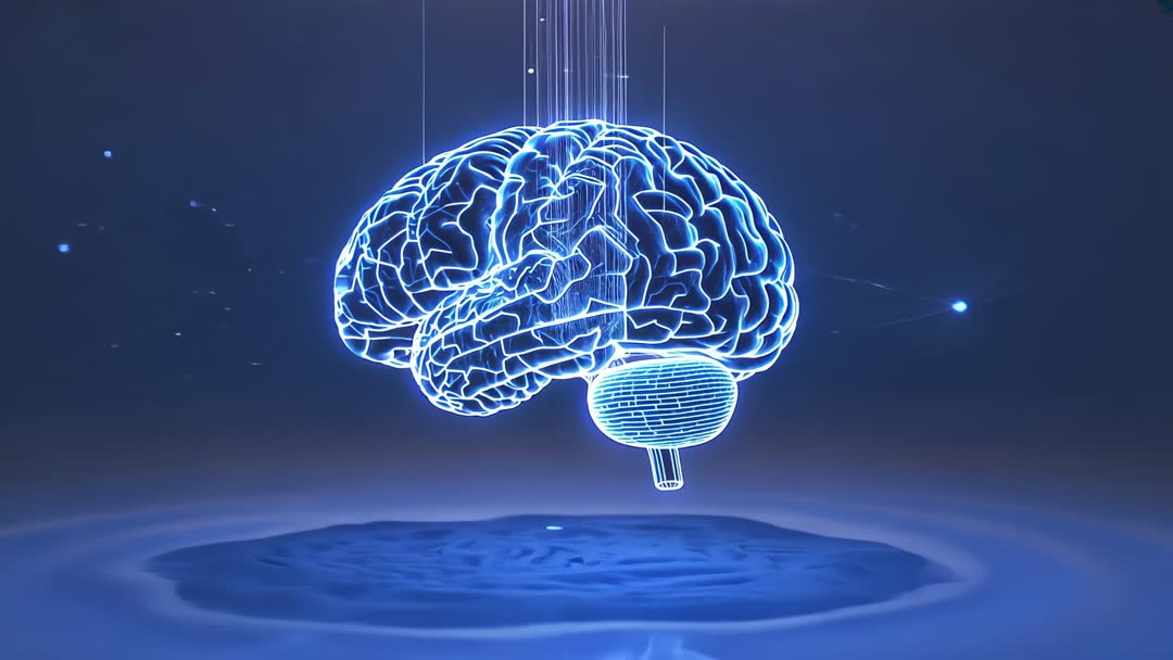 AI Generated Image. Showing holographic neon brain rotating above virtual pool with vertical data beams falling and reflecting on rippling surface. Wireframe cerebellum lowering and rotating, pulsing with electric blue glow and trailing particles. Offering futuristic, high-tech mood for AI visualization, neuroscience explainer, technology promo, medical visualization, conference opener, website hero, social media ad. Working as loopable background, title sequence, lower third backdrop, or overlay for text and icons. Allowing color grading, speed adjustment, particle density tuning for brand consistency and multi-platform use.