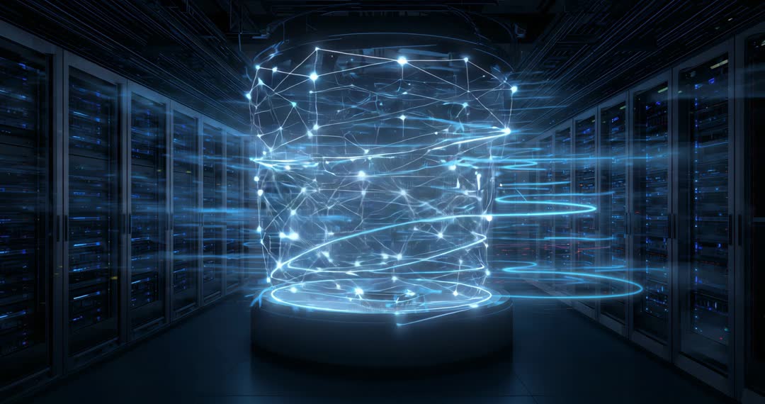 AI Generated Image. A holographic digital network projection emanates from a glowing pedestal in a server room, showcasing high-tech innovation. Blue LEDs in the surrounding server racks accentuate the futuristic atmosphere, symbolizing advanced connectivity and computing power. Ideal for illustrating concepts of AI development, digital transformation, and state-of-the-art technology implementations, especially in computer networks and data automation environments.