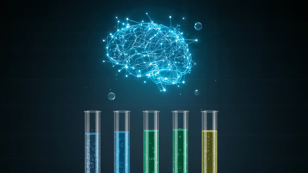 AI Generated Image. Holographic neural network brain pulsing above five glass test tubes as bubbles rise through blue, green and yellow liquids. Neon-lit digital brain connecting nodes and lines, conveying data flow, network activity and algorithmic processing. Composition showing crisp reflections on glassware and high-contrast dark background for dramatic visual impact. Ideal for technology presentations, AI research videos, biotech marketing, neuroscience explainer sequences, laboratory safety training, startup pitch decks, website hero loops, educational content and social media promos. Motion-friendly frame allowing title overlays, lower-thirds, infographic inserts and color grading to match brand palette.