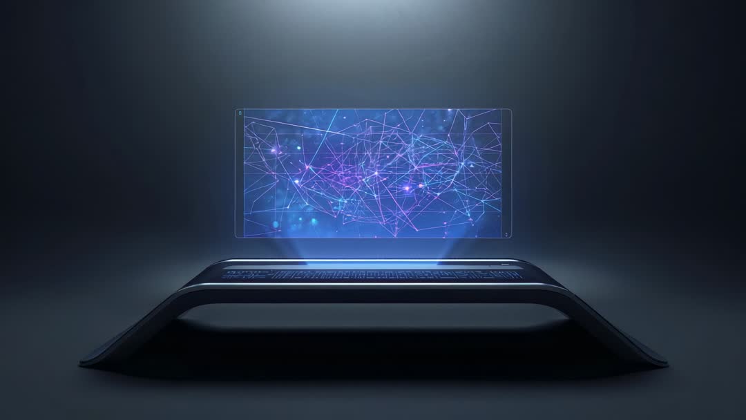 Holographic Neural Network Demo Projecting from Sleek Black Platform for Futuristic Tech Pitch Video