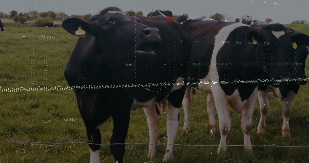 Holstein dairy cows in a green pasture, underscored by a digital overlay of live sensor data, depicting agricultural innovation. This unique visualization integrates technology into traditional pastoral scenes. Suitable for use in articles or presentations focusing on smart farming, livestock monitoring, innovations in agriculture, and sustainability efforts in farming.