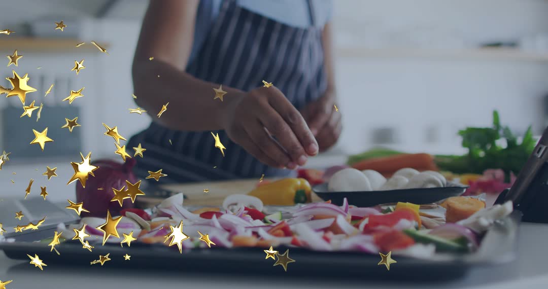 Showcasing home cook reaching eggs and arranging colorful chopped vegetables on roasting tray, gold star graphics floating across frame. Close-up action highlighting hands, chef apron, fresh bell peppers, red onion, mushrooms, and cutting board. Capturing natural meal prep flow for recipe video, cooking tutorial, social media reel, YouTube thumbnail, blog content, or cooking class promotion. Pairing festive gold star overlay with home cooking theme for holiday campaign, product launch, or family-focused marketing. Recommend adding step-by-step text overlay, ingredient list, or logo for branded content. Ideal for promoting meal kits, kitchenware, healthy eating, vegetarian recipes, and engaging short-form video content.