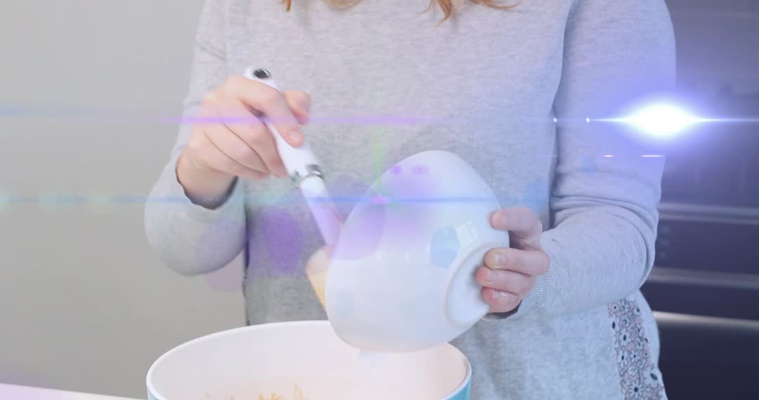 Video showing home cook scraping cake batter into mixing bowl with silicone spatula, hands steadying ceramic bowl. Close-up mid shot highlighting batter texture, hand movement, and gentle scraping motion. Cinematic lens flares adding polished, modern visual flare for lifestyle and food content. Usage ideas include recipe video intros, step-by-step baking tutorials, social media reels, kitchen product demos, cookbook backgrounds, and online cooking class clips. Ideal for brands promoting spatulas, mixing bowls, baking appliances, ingredient packaging, or culinary workshops. Color palette and composition supporting modern home baking, DIY dessert guides, and editorial food stories.