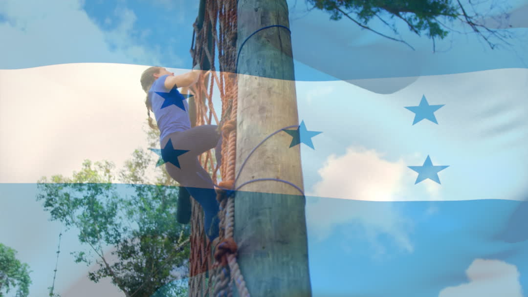 The video depicts a Caucasian woman training on an obstacle course, with a semitransparent Honduran flag overlay. Ideal for promoting sports events, physical endurance themes, motivational content stressing determination, or materials highlighting national pride in athletics.
