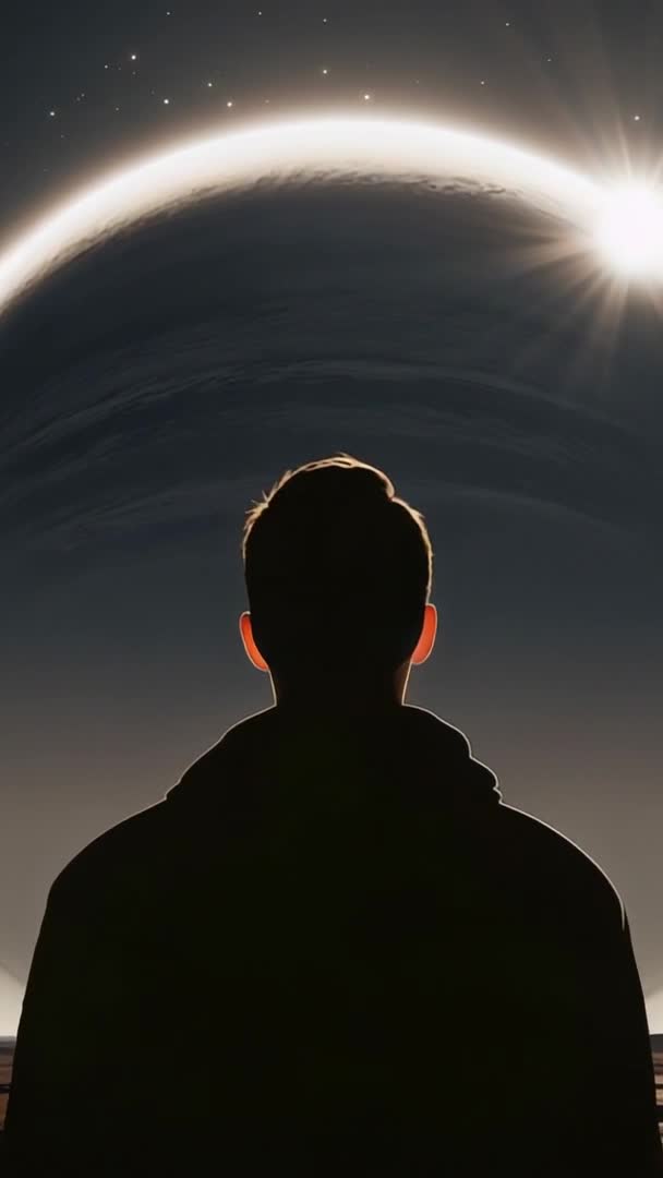 AI Generated Image. Hooded figure standing on desert plain, watching planetary dawn with massive planet and star-filled sky rising on horizon. Backlit rim lighting creating deep silhouette and cinematic contrast; vertical composition emphasizing scale and solitude. Evoking themes of wonder, exploration, adventure, and introspection for use in sci-fi trailers, film intros, app backgrounds, social media vertical ads, and smartphone wallpapers. Suggested treatments: pairing with ambient or orchestral music for title sequences, adding motivational text overlays for hero banners, using slow zoom for meditative clips, or incorporating into travel or exploration campaign visuals. Color grading options: cool desaturated palette for mysterious mood or warm highlights for hopeful sunrise tone.