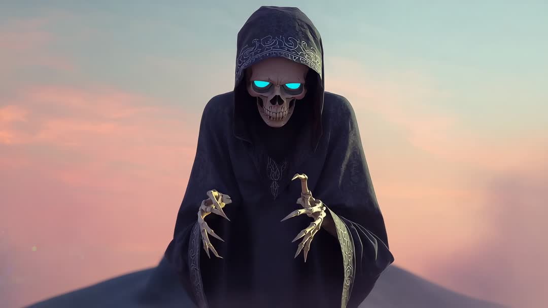 Hooded Skeletal Figure Emerges on Misty Dune at Dusk in Dark Fantasy Video Video