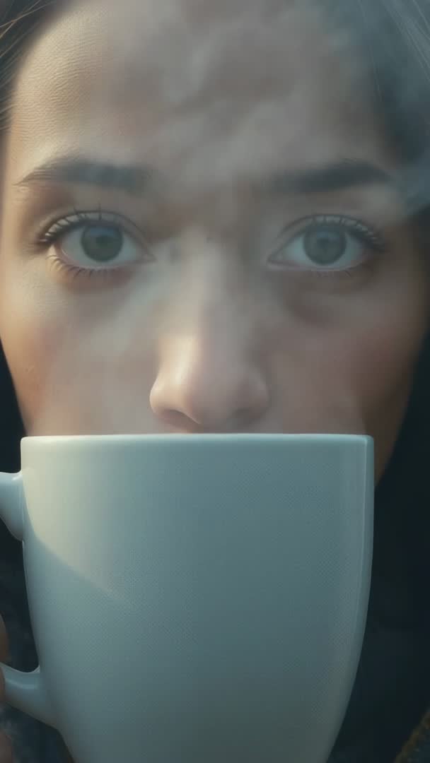 AI Generated Video. Showing hooded woman holding white ceramic mug close to face while steam is rising and gaze is meeting camera. Closeup framing capturing eyes, nose bridge, and top rim of mug with soft, moody light and shallow depth of field. Visual mood conveying warmth against chill, introspection, comfort, and quiet moment. Vertical video format optimized for mobile platforms and social media stories. Suggested uses: coffee or tea brand vertical ads, morning routine and wellness content, social media reels and stories, mental health and lifestyle articles, cinematic intros and promos, product packaging mockups, stock footage for editorial pieces. Creative directions: pair with gentle ambient soundtrack, add voiceover about comfort or self care, color grade for cooler tones to emphasize contrast between steam and skin, crop for tighter portrait shots or include subtitle area at bottom for messaging.