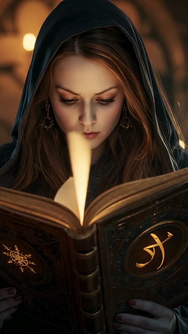 AI Generated Image. Vertical clip featuring hooded woman reading glowing grimoire, meeting viewer gaze, turning pages while candlelight flickering and arcane symbols glowing. Mood blending mysticism, ritual, medieval fantasy, and cinematic drama. Use for book trailers, fantasy game promos, streaming channel intros, social media reels, Halloween campaigns, occult podcast promos, editorial pieces about esotericism, or background for title sequences. Frame composing working well for portrait-first platforms and mobile vertical ads. Color grading supporting dark moody tones, audio layering supporting whispered narration or ambient choir, slow zoom and subtle VFX integration working well for rhythm edits and promotional montages.