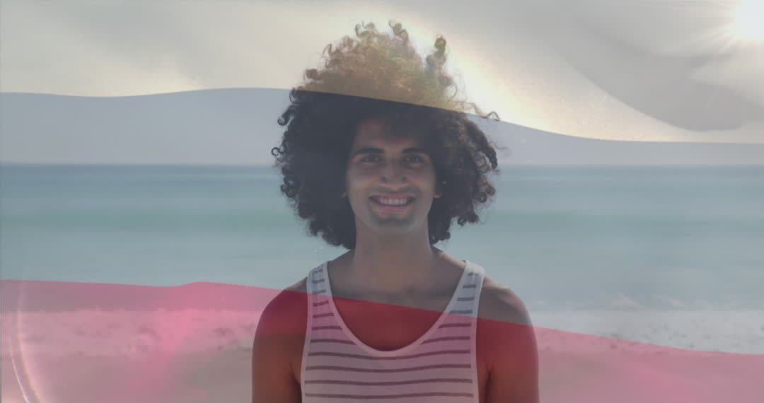This video captures a joyful man enjoying a sunny, breezy day at the beach, overlaid with a waving flag. It communicates themes of freedom, optimism, and relaxation, making it ideal for use in content about vacation promotions, lifestyle blogs focusing on happiness and liberty, or as an illustration in articles discussing cultural diversity and patriotism.