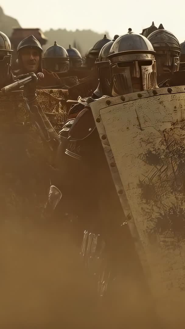 AI Generated Video. Showing armored soldiers advancing in tight shield formation across dusty plain while horn sounding and dust rising. Capturing moody cinematic lighting, sepia tones, silhouette horizon for dramatic effect. Working well for historical drama trailers, game cinematic promos, documentary openings, social media vertical ads, event intros, museum displays. Suggesting sound design using deep horn, marching drums, and wind for immersive experience. Suggesting slow motion inserts, dramatic closeups, and color grading toward warm desaturated palette. Allowing title overlay placement in top or bottom safe area for 9:16 format. Conveying themes of unity, courage, tension, and impending conflict for marketing, editorial, and cinematic projects.