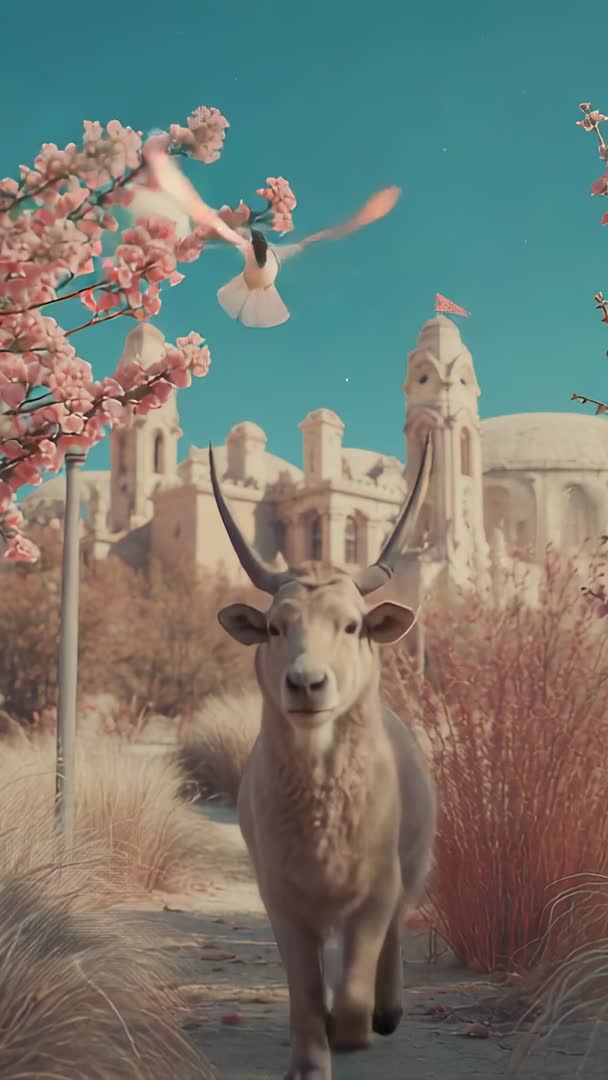 AI Generated Image. Vertical clip showing horned bovine walking toward viewer along dirt path lined with pink blossoms. Bird flying overhead between branches while ornate castle-like architecture rising in background under clear teal sky. Soft pastel palette and cinematic shallow depth creating dreamlike, storybook mood. Slow forward motion and calm animal gaze evoking meditative, pastoral atmosphere. Suitable for social media reels, vertical ads, mindfulness and wellness apps, travel and tourism promos, luxury brand storytelling, children’s book animation, title sequences, mobile app backgrounds, editorial features on rural life or surreal landscapes. Color grading suggestions: warm highlights, teal sky, soft contrast; music suggestions: ambient piano or gentle strings.