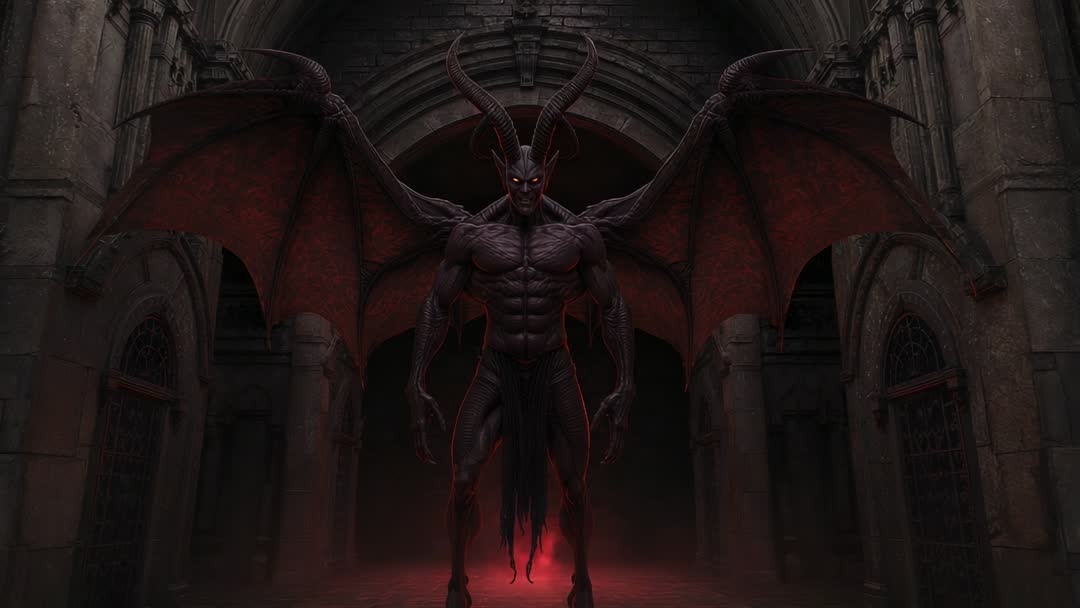 - Horned Demon Unfolding Wings in Gothic Cathedral Cinematic Scene