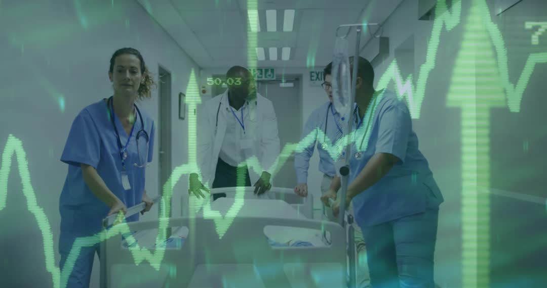 Medical team urgently navigating hospital corridor with real-time ECG data overlay. Image captures healthcare professionals synchronized in teamwork, highlighting the fast-paced and high-stakes environment typical in emergency situations. Suitable for illustrating medical concepts, healthcare systems, and teamwork efficiency, this provides a valuable visual for stories about medical scenarios or professional healthcare environments.