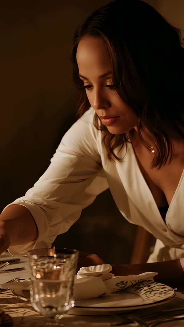 AI Generated Video. Video showing hostess in white blouse carefully arranging napkin on plate and aligning glassware under warm candlelight. Close up composition highlighting hands, tableware textures, plate pattern, and soft glow creating intimate mood. Useful for restaurant promo, hospitality training, event planning, social media Reels, lifestyle vlog, dinner party invitation, romantic dinner campaign, cookbook intro, website hero clip. Editing suggestions: use slow-motion cut for tactile detail, apply warm color grade, add soft piano or ambient crowd noise, and include voiceover about service or reservation details. Clip working well as overlay for copy about hospitality, elegant entertaining, table presentation, or date night experiences.