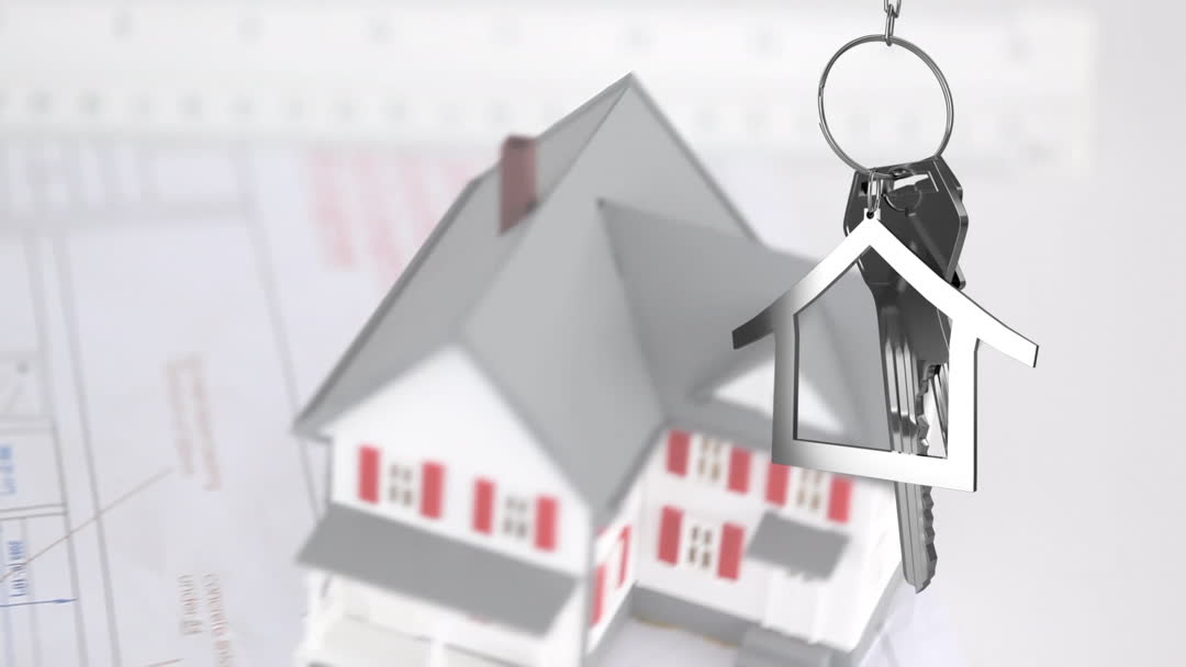 Animation portrays a set of house keys quickly descending over a blurred representation of a house and architectural blueprint. Ideal for illustrating concepts related to real estate, property acquisition, or home financing. Useful in presentations, websites, or advertisements targeting mortgage services, real estate agencies, or housing market trends.