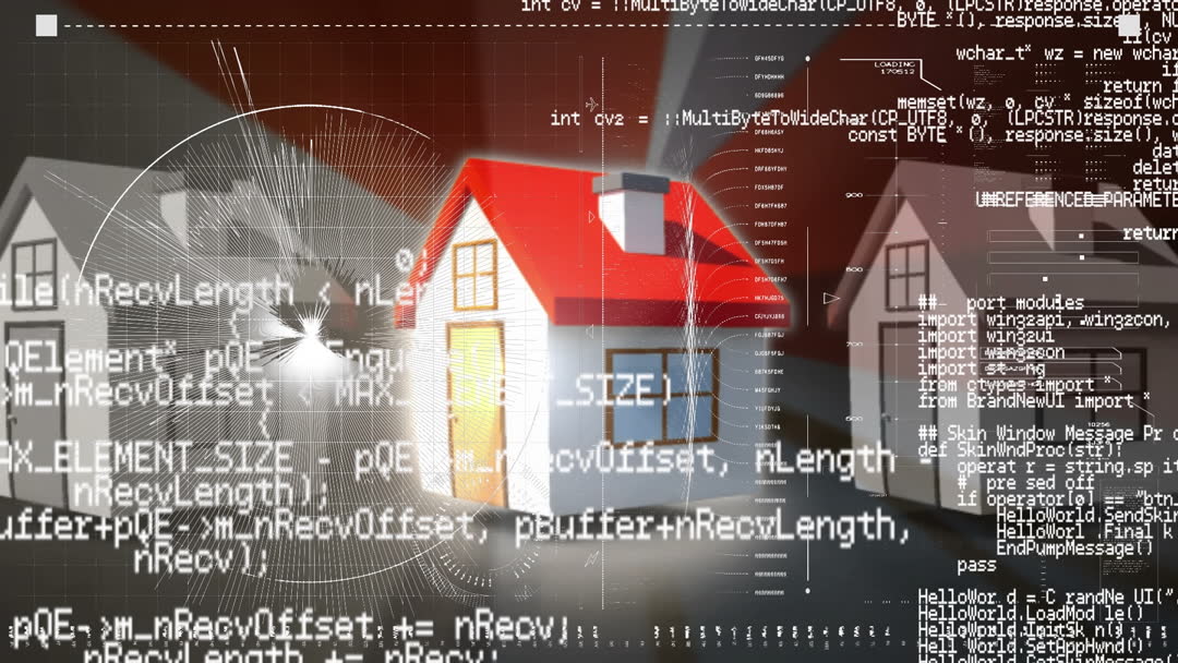 Image depicting house models integrated with a digital interface featuring coding and heads-up display (HUD) elements, representing the intersection of real estate with technology. Could be used in presentations about smart homes, the future of property innovations, or tech-driven architectural designs.