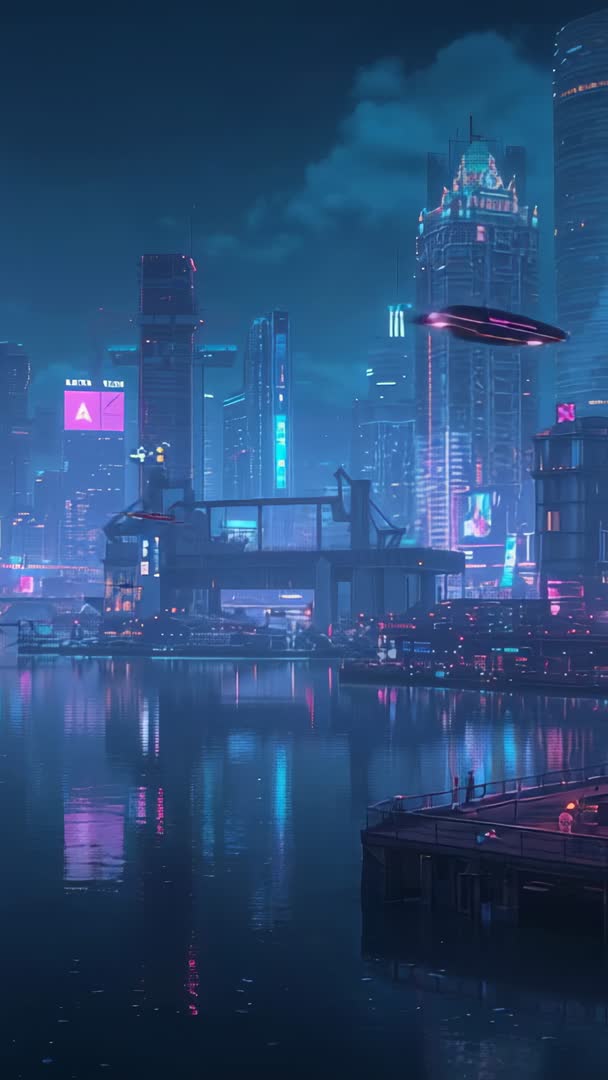- Hovercraft Gliding Over Neon Cyberpunk Harbor Vertical Night Skyline with Reflective Water