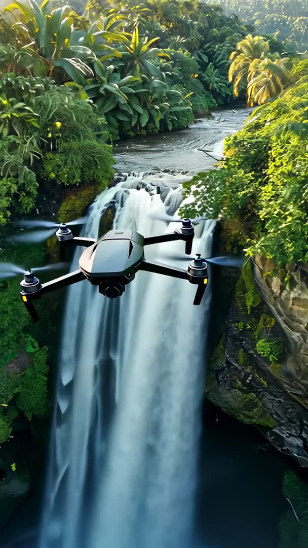 AI Generated Image. Showing hovering quadcopter capturing misty tropical waterfall from vertical aerial perspective. Framing lush rainforest vegetation, rocky gorge, sunlit spray, and fast-moving cascade to convey dramatic scale and motion. Offering cinematic movement and immersive vertical composition for drone footage projects. Useful for travel promotion, adventure vlog intros, tourism website hero clips, environmental conservation campaigns, outdoor gear commercials, and aerial cinematography demos. Providing stable gimbal footage with slow-motion potential and strong color-grading flexibility. Including usage ideas: pairing with ambient water sounds, adding cinematic music bed, using as opener for island or jungle travel series, inserting into vertical social ads for mobile platforms, or integrating into documentary sequences showcasing remote landscapes.