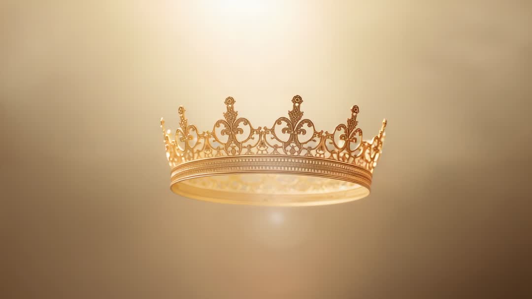 - Hovering Golden Crown Rotating in Misty Studio Light Revealing Ornate Filigree and Halo