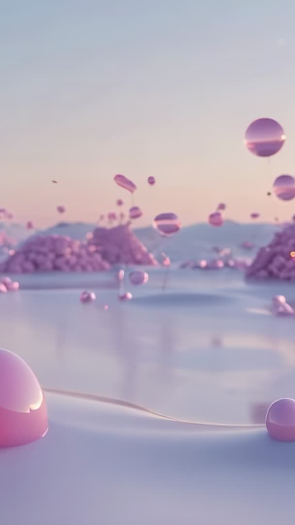 AI Generated Image. Vertical video opens with hovering pink spheres drifting slowly across glossy pastel plane. Spheres coalescing and forming shallow liquid pools that ripple with soft reflections and subtle highlights. Color palette using muted pinks and lilac with warm sunrise gradient, creating tranquil and dreamy atmosphere. Composition using shallow depth of field and gentle camera moves to emphasize minimal forms and smooth surfaces. Loop friendly animation with seamless motion for continuous playback. Ideal for vertical mobile backgrounds, Instagram Stories, TikTok reels, app intros, meditation and wellness app visuals, music visualizers, beauty and tech advertising, product launch backdrops, on-screen loops for retail displays, and editorial video about design or futurism. Works well as calming brand hero reel, social media headers, or ambient display content in modern retail and hospitality environments. 9:16 vertical aspect ratio, artful abstract mood, adaptable for color grading and overlaying text or logo.