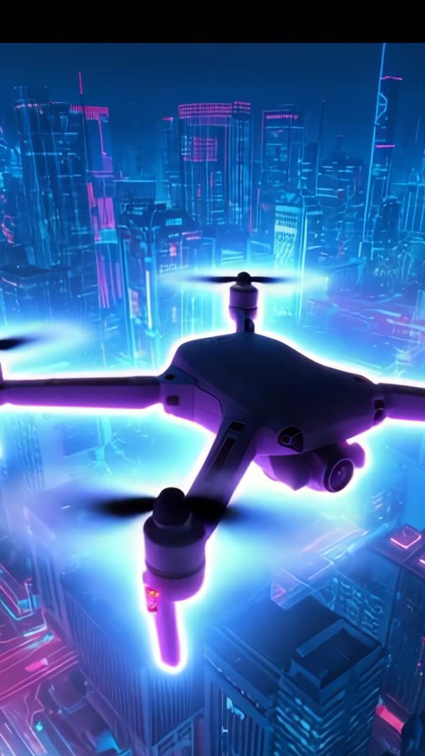 - Hovering quadcopter soaring above neon cyberpunk city skyline vertical video