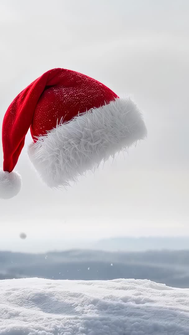 AI Generated Video. Vertical holiday clip showing red Santa hat hovering over snowy landscape while rotating and drifting with gentle snowfall. Fluffy white trim and pompom collecting frost and soft snowflakes, adding texture and motion. Pale sky and distant hills providing clean negative space for overlaying text, logo, countdown, or seasonal message. Perfect for Instagram Stories, TikTok, Reels, mobile ads, digital greeting cards, seasonal product promos, retail signage. Loop-friendly composition and tall aspect ratio optimized for mobile viewing and social video campaigns. Suggestions: add subtle music, animated text, brand logo, color grading to match campaign style.