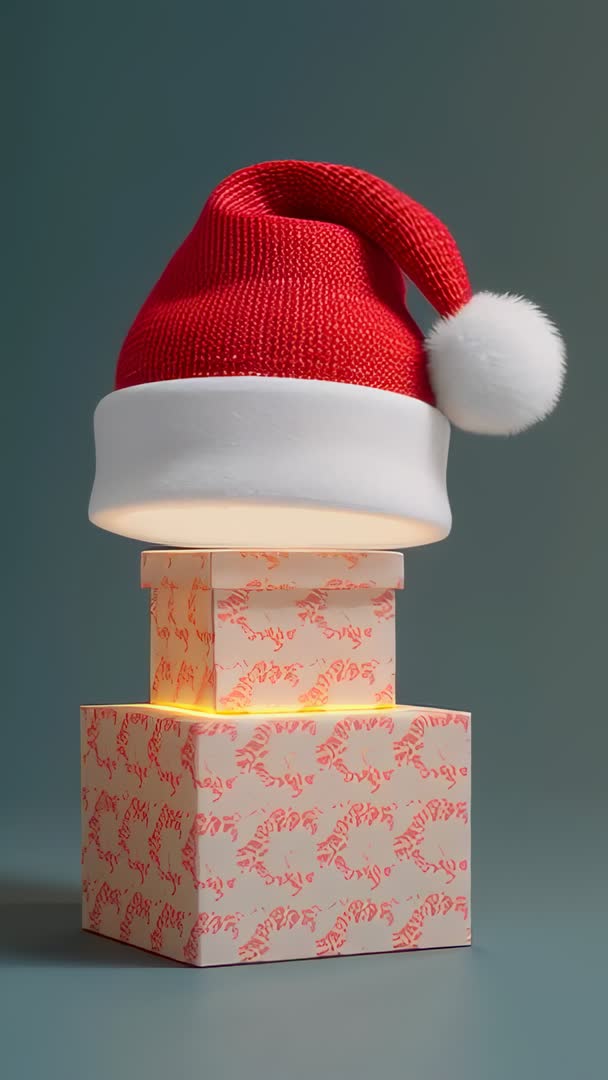 AI Generated Video. Showing hovering red Santa hat with white pompom above two patterned gift boxes, camera shifting slightly to create warm amber glow between stacked boxes. Composed in vertical format for mobile-first playback, featuring soft studio lighting and muted teal background for contrast. Presenting clean minimal composition with ample negative space for overlaying text or logos. Suiting holiday social media reels, Instagram Stories, TikTok ads, email headers, landing page hero sections, gift guide videos, product reveal sequences, festive commercial spots, seasonal retail displays. Enabling seamless looping and slow-motion editing, providing space for branded overlays, countdowns, animated typography, and music cues. Ideal for marketers, content creators, e-commerce, retail promotions, and greeting card animations.