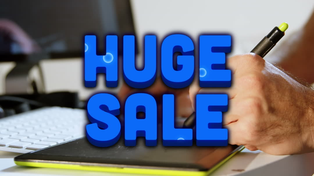 Man uses a graphic tablet while 'Huge Sale' text appears. Perfect for promoting sales, marketing campaigns, online shopping events, art and design.