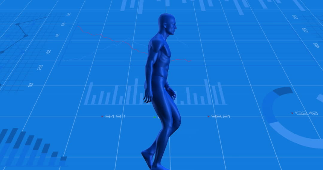 Human model animation walking through statistical data overlayed on a blue background suggests themes related to medical research, technological development, and futurism. This depiction emphasizes the intersection of human biology with data analytics and could be used in contexts such as health data presentations, medical industry PowerPoints, futuristic tech explorations, or educational materials focusing on the use of technology in medicine.