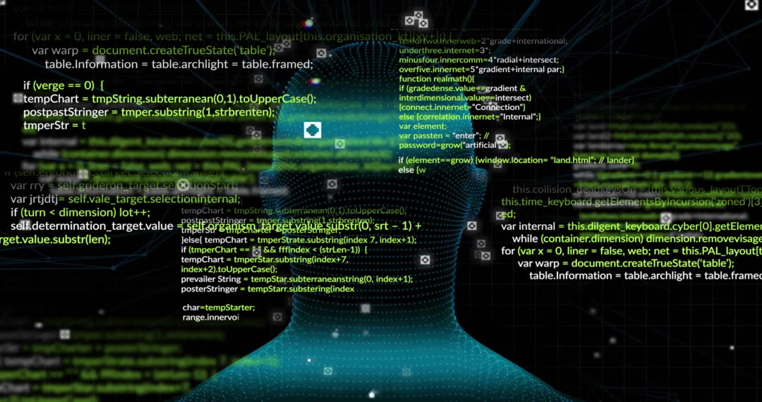 This concept illustration shows a human head combined with overlayed code and data, symbolizing artificial intelligence and computing processes. Ideal for use in tech blogs, educational presentations, and AI-related articles emphasizing digital transformation or virtual reality themes.