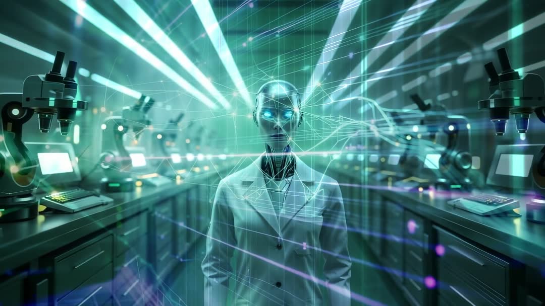 Humanoid Android Integrating with Digital Network in Futuristic Laboratory Video