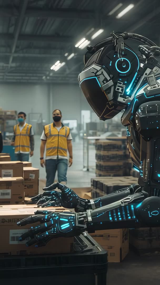 AI Generated Image. Showcasing humanoid robot placing boxes into tote at pack bay while masked warehouse staff in hi-vis vests are observing from background. Vertical format providing tall composition and generous left-side copy space for titles, logos, subtitles, and lower-third graphics. Visual focus on robot arms with glowing blue accents interacting with cardboard parcels on sorting table, creating clear foreground action with soft industrial background. Ideal for illustrating warehouse automation, robotics in logistics, e-commerce fulfillment workflows, and industry 4.0 concepts. Supporting use in corporate product demos, promotional ads for fulfillment services, training modules on human-robot collaboration and workplace safety, and editorial segments about future of work. Delivering clean industrial aesthetic and simple composition for easy color grading, captioning, and overlaying brand messaging.