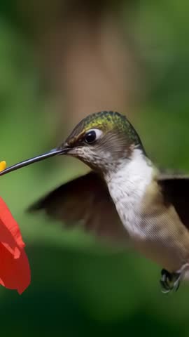 AI Generated Video. Video showing hummingbird hovering at red flower, probing nectar with long bill. Clip featuring tight close-up on head and eye, wing motion blur, vibrant red and green color contrast, shallow depth-of-field creating smooth bokeh background. Vertical composition matching mobile platforms and social media reels. Footage working well for nature documentaries, educational segments about pollination, environmental campaigns, garden design promotions, and backyard bird watching content. Clip allowing slow-motion playback, seamless looping, text overlay, and voiceover about wildlife behavior. Clean background providing space for logo placement and lower-third graphics, suitable for intro sequences, ad spots, or calming ambient loops.