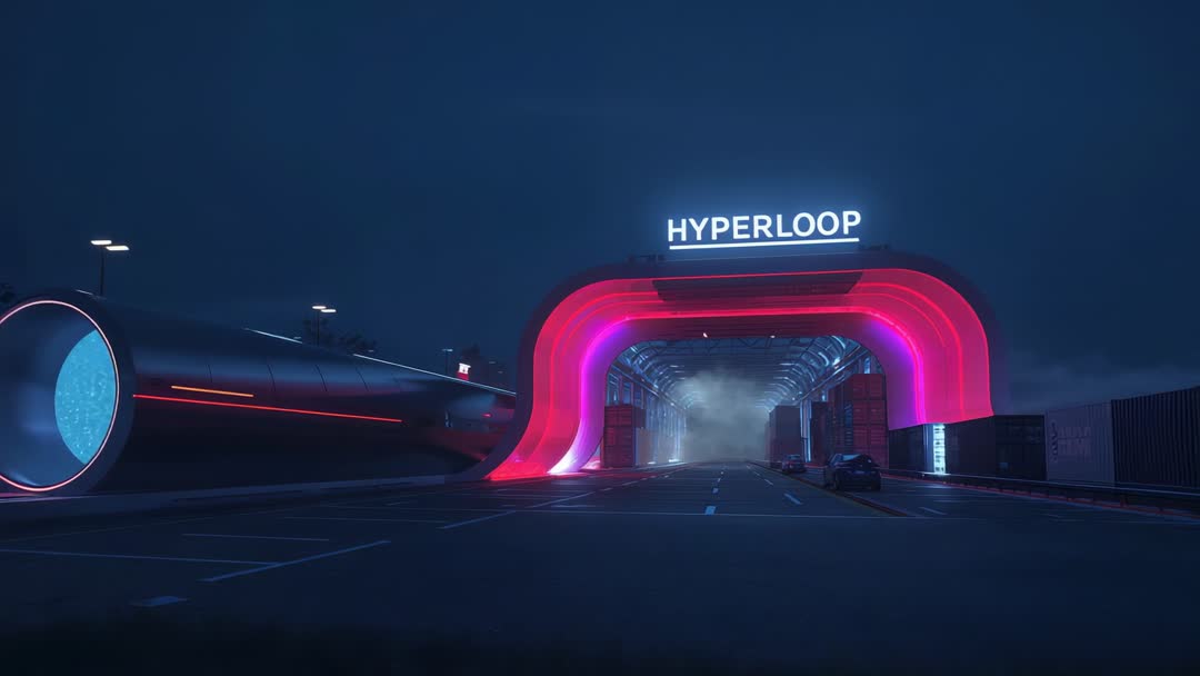 AI Generated Image. Video showing pulsing neon-lit Hyperloop arch pushing fog deeper into tunnel at night. Long cylindrical Hyperloop pod resting left of arch while shipping containers lining interior and car sitting right on road lanes leading into terminal. Scene featuring deep blue night sky contrasted by magenta and pink neon glow around arch and tunnel mouth. Atmosphere feeling cinematic and cyberpunk with low fog and illuminated signage reading 'HYPERLOOP'. Suitable for tech presentations, futuristic transport concept reels, sci-fi backgrounds, website hero banners, startup pitch decks, infrastructure visualizations, editorial on high-speed transit. Suggested uses include widescreen hero video, motion graphics backdrop, title sequence, social media ads, exhibition displays and trade show booths. Editing tips: crop for 16:9 or ultrawide, add subtle camera dolly or parallax for motion, overlay bold headline near signage, adjust color grading to emphasize neon tones, add sound design for immersive impact.