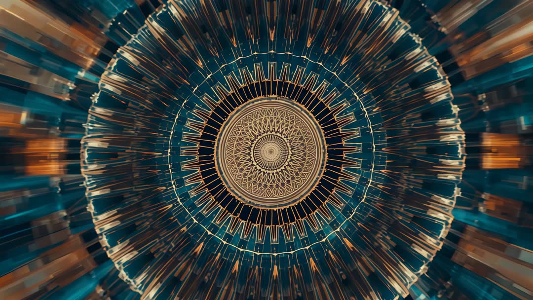 AI Generated Image. Visually intriguing video showcasing a digital mandala with rotating and pulsing amber and teal rings. Its geometric symmetry creates a mesmerizing kaleidoscopic effect, inviting viewers into a hypnotic, meditative state. Perfect for use in projects related to abstract art, meditation guides, or immersive visual displays aimed at creating a calm, zen effect. Also suitable for AI-generated art showcases or music video backgrounds aiming to captivate through vibrant and dynamic designs.