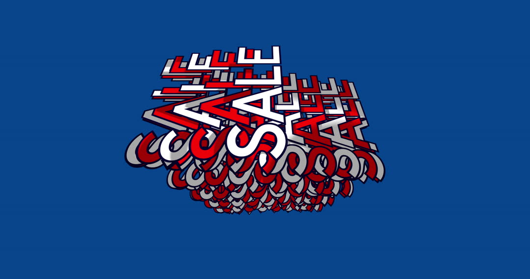 Dynamic and eye-catching visual featuring strong sale text in white and red letters moving in a complex zigzag pattern against a vivid blue backdrop. Perfect for promoting sales, attracting customers in retail environments, digital marketing campaigns, and online advertisement platforms.