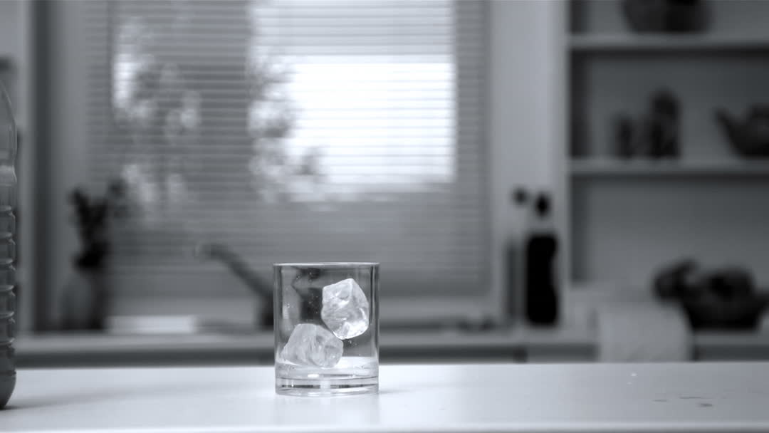 This video features two ice cubes gracefully dropping into an empty glass, capturing the motion in stunning black and white. The scene is set in a modern kitchen with a minimalistic design. This visual can be used for articles or advertisements on refreshing beverages, kitchen interior design, or moments of relaxation at home. Ideal for use in marketing materials that emphasize minimalism or highlighting home-living settings.
