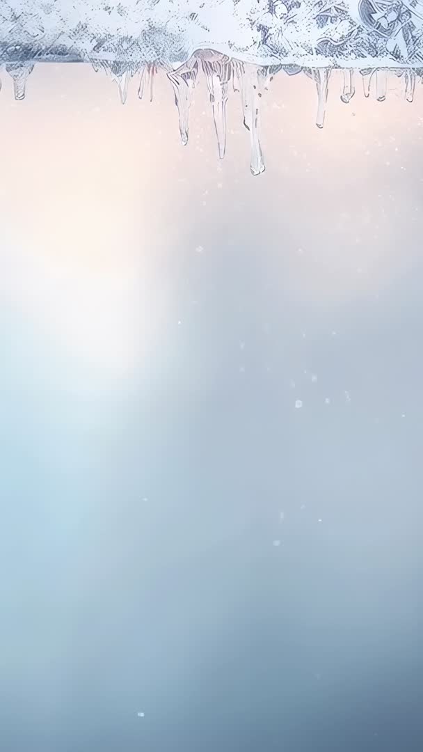 AI Generated Video. Showing icicles hanging from roof eave while snowflakes drift downward, peach glow casting gentle warm highlight. Providing vertical video format with tall composition and generous negative space for text and titles. Blending cool blue tones with warm peach accent to create tranquil winter mood for seasonal projects. Serving as ideal background for mobile stories, social media reels, weather segments, holiday promotions, website headers, calming video overlays, and seasonal ads. Suggesting slow pan or subtle zoom and adding headline or logo into negative space for polished result.