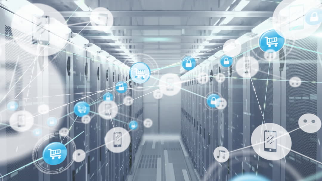 Modern data center with animated network connections demonstrating the flow of digital information. Icons overlayed display online shopping, security, communication, and media, indicating technological integration across various sectors. This would be ideal for illustrating topics on digital infrastructure, cybersecurity, cloud services, and data management solutions in presentations or tech company marketing materials.