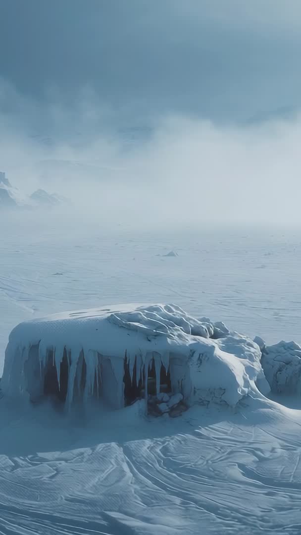 AI Generated Video. Showing ice-covered rock with hanging icicles on frozen coastal plain, fog drifting across horizon and soft light washing scene. Featuring textured snow foreground, wind-sculpted patterns, and distant low-contrast mountains for strong sense of scale. Evoking cold, isolation, and cinematic mood with cool blue palette and ample negative space. Working well for documentary and editorial footage about Arctic, climate change, polar research, and extreme weather. Ideal for social media vertical video, smartphone background, opening shot for film, or commercial background for winter product campaigns. Allowing slow-motion or time-lapse edits to emphasize fog movement and shifting light. Supplying clean space for title overlays, captions, or lower-third graphics and for use in environmental presentations, travel features, and stock footage libraries.