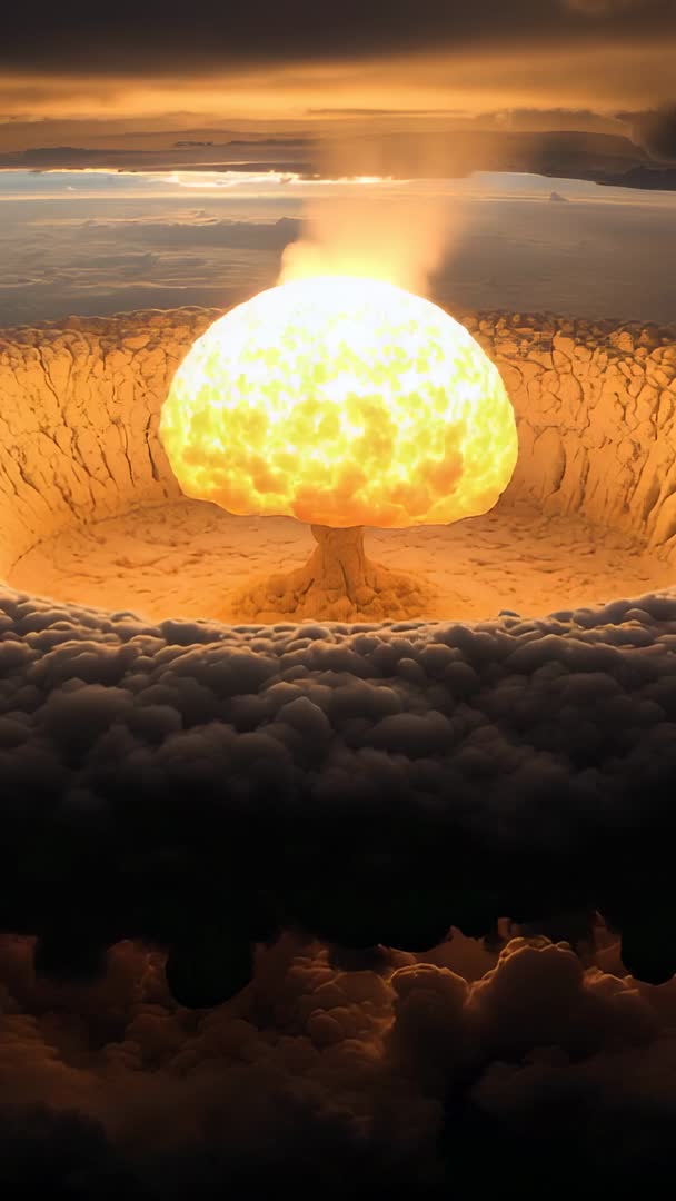 AI Generated Image. Vertical cinematic clip showing igniting fireball forming towering mushroom cloud above dense cloud banks, casting intense orange glow across horizon. Camera capturing aerial perspective from above cloud layer, emphasizing scale of blast, textured crater rim, and rolling smoke. Visual mood evoking tension, catastrophe, dramatic energy release; useful for conveying high-stakes impact or disaster scenarios. Providing strong focal point in bright upper frame while dark lower clouds creating natural space for headline text or lower-third graphics. Optimizing for vertical mobile formats such as reels, stories, and short-form ads. Suggested post-production: boosting contrast, deepening shadows, enhancing warm tones, and adding subtle grain for cinematic feel. Usage ideas: disaster news graphics, sci-fi trailer sequences, educational content about impact events, documentary intros, game cutscenes, emergency preparedness campaigns, promotional teasers, background for title animations. Licensing guidance: suitable for editorial and commercial usage depending on context; recommending verification of legal or ethical considerations before linking to real events.