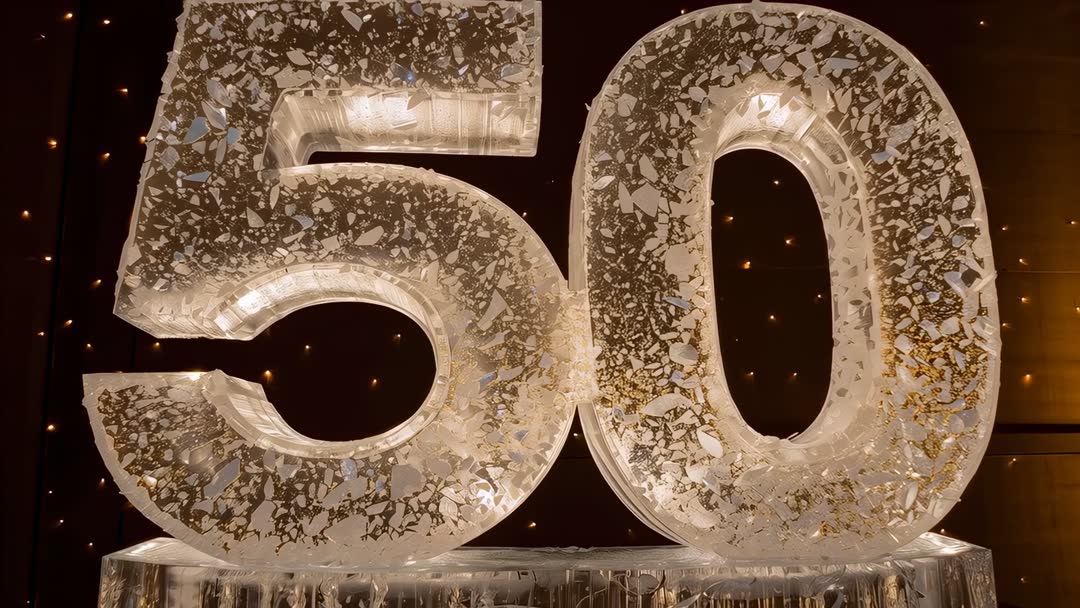 AI Generated Video. Video clip showing oversized 50 ice sculpture embedded with gold flakes and internal LED lighting, standing on clear ice pedestal against dark curtain with twinkling warm lights. Camera holding steady on close-up reveal of textured ice, suspended air bubbles, reflective gold inclusions catching warm glow. Slow panning highlighting numeral contours and crystalline details, showcasing luxurious milestone decor and festive atmosphere. Working well for anniversary promo, gala highlight reels, event planning websites, venue marketing, luxury brand campaigns, catering portfolios, social media storytelling. Offering licensing-friendly clip for editorial coverage of milestone celebrations, hospitality marketing, product launch events, seasonal party features. Color palette featuring warm gold and amber highlights against cool translucent ice, suiting elegant, upscale mood boards.