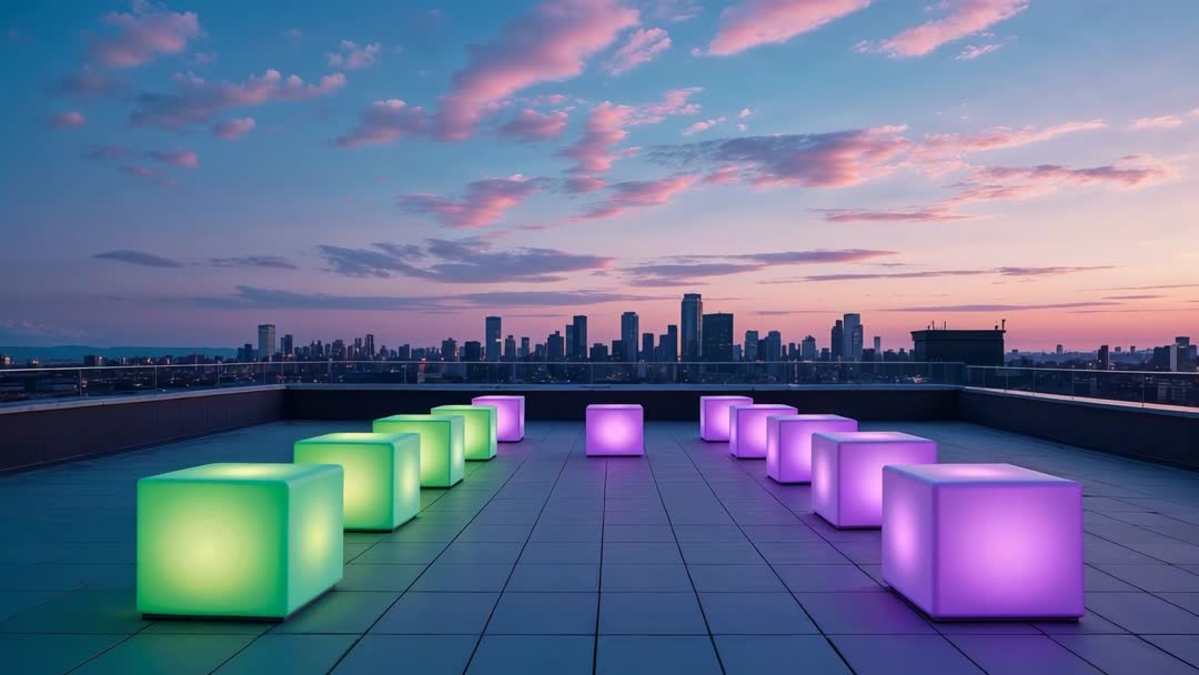 - Illuminated Cubes on Rooftop Terrace Overlooking City Skyline